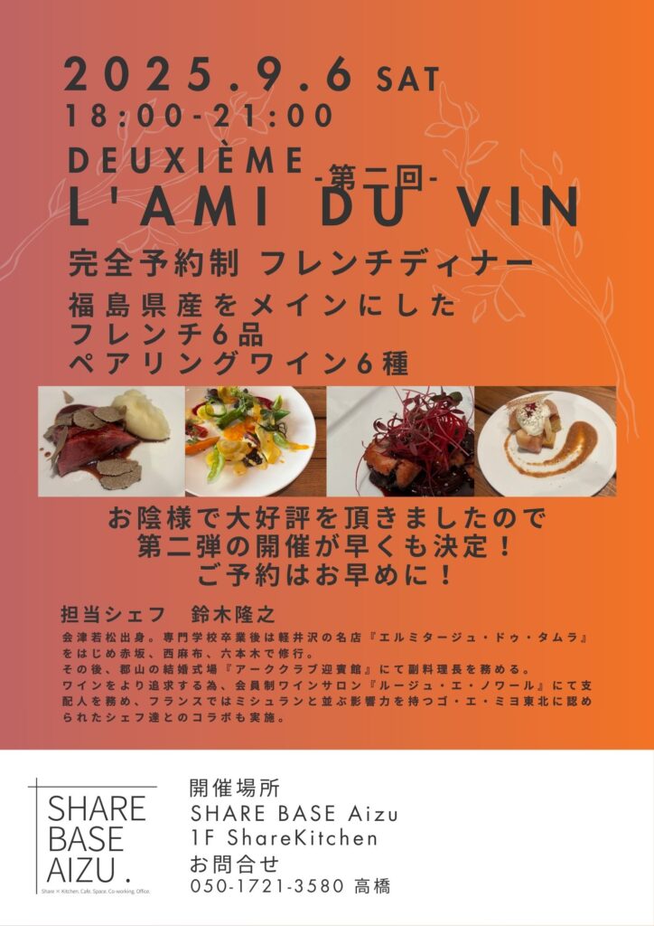 今回も福島県産の食材をメインにしたフレンチコース6品にペアリングワイン6種をご用意!