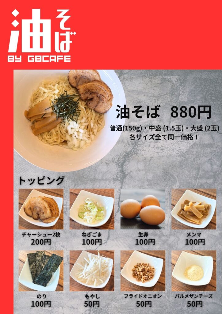 メインは油そばのみ!(大・中・小 一律 880円)