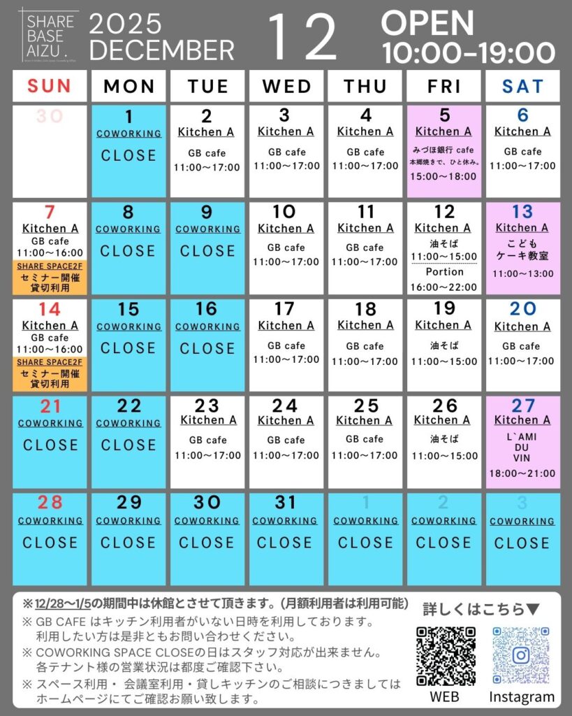 SHARE BASE Aizu 12月営業日について
