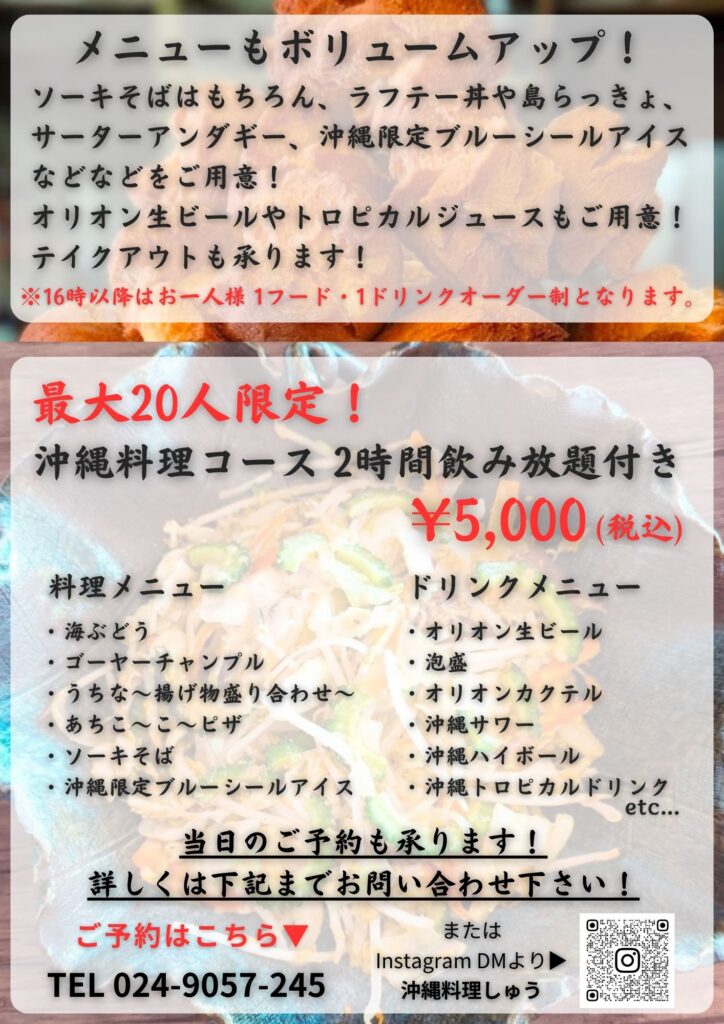 郡山にて営業されている「沖縄料理 しゅう」様に期間限定でご出店頂けます!