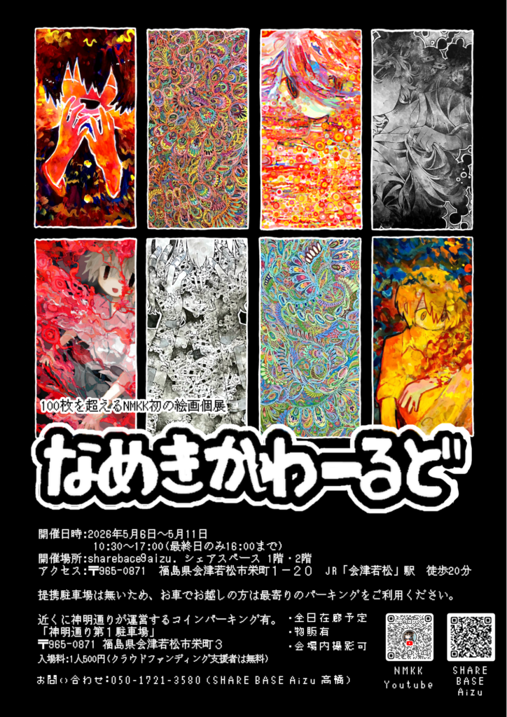 SHARE BASE Aizu にて、アーティストNMKKによる初の大規模原画展「なめきかわーるど」が、2026年5月6日(水)〜5月11日(月)まで開催されます!
